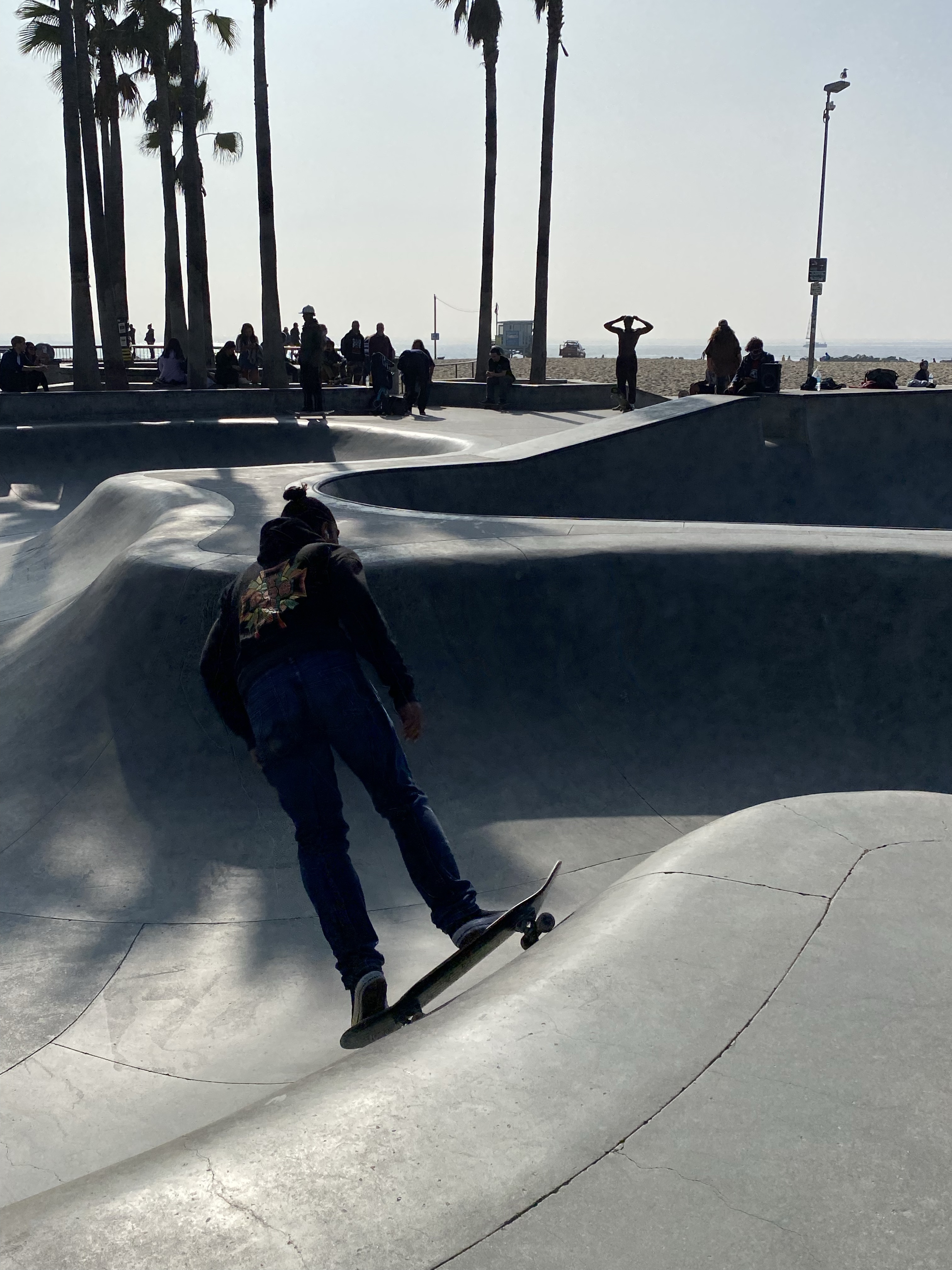 Em um domingo de sol vimos o pessoal do skate e dos patins dando show na Venice Beach e as casas nos canais de lá (Historic District – a Veneza californiana). No mesmo domingo de tarde fomos para Santa Monica que fica ao lado e “almojantamos” com o lindo por do sol de lá.