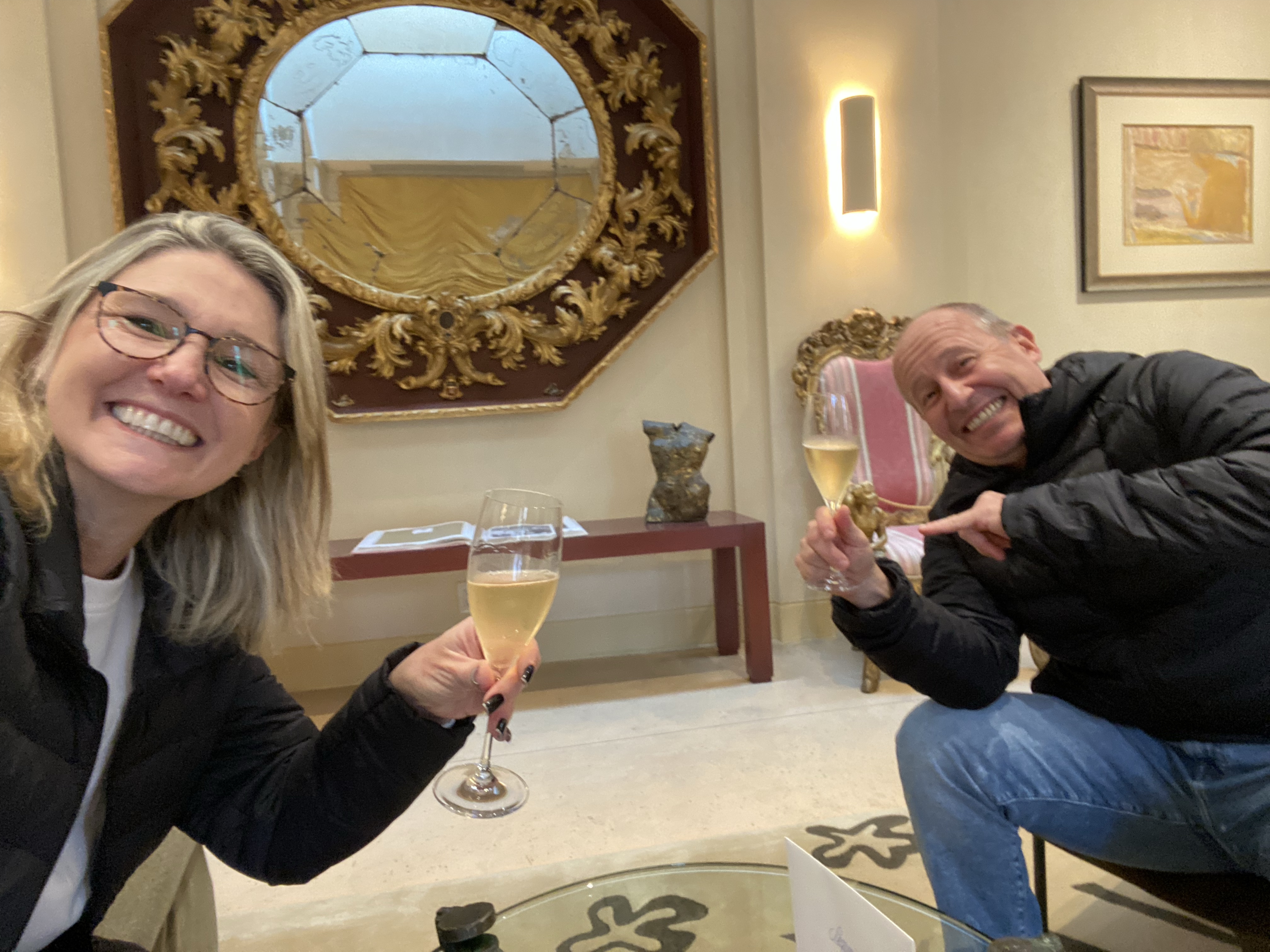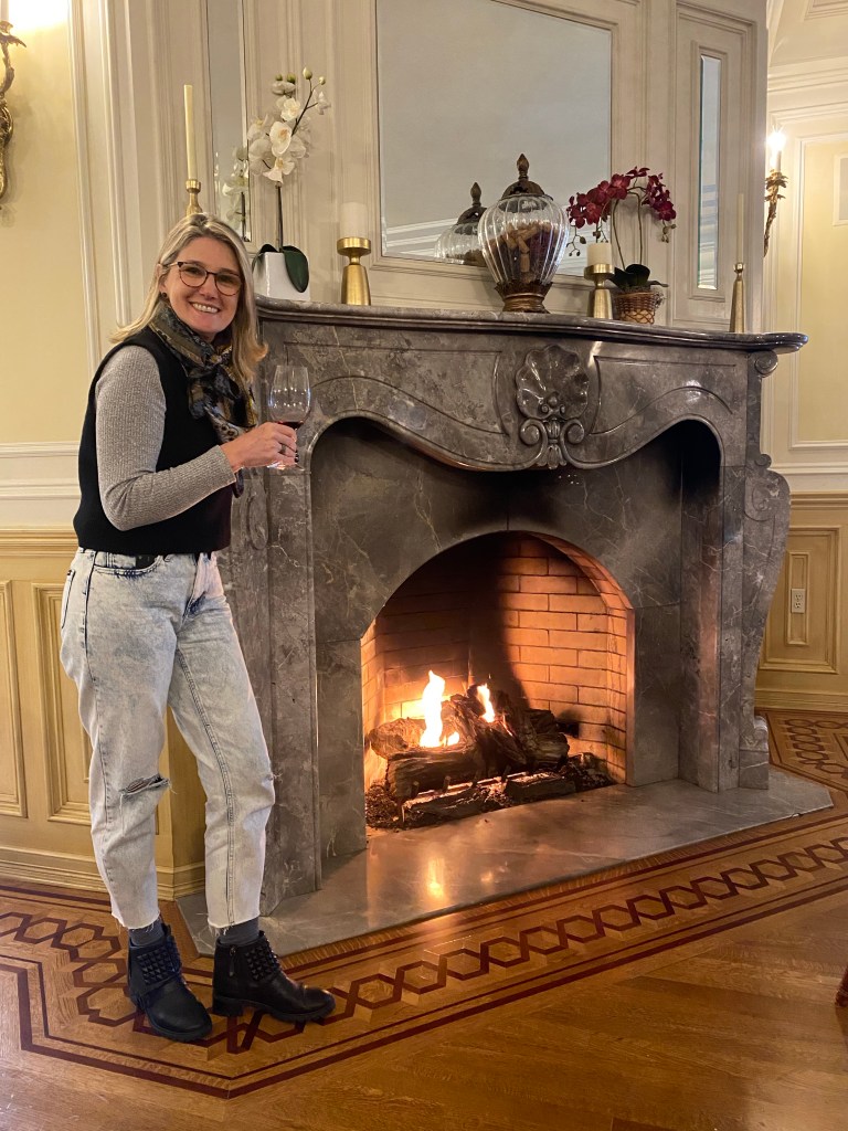 Gente… eu estava em outra dimensão fotografando. Só ouvi um burburinho. Mas meu marido, menos viajandão, entendeu e se acusou. Todos os olhares se voltaram para nós, os intrusos. Mortos de vergonha fomos escoltados de volta para nosso cantinho da degustação mais simples, perto de uma deslumbrante lareira, totalmente personalizado com nosso bilhete de boas-vindas. Mas abandonamos o grupo sob protestos do noivo gentilíssimo que queria nos acolher na festa a todo custo. Uma simpatia! Valeram ótimas gargalhadas e duas taças de champagne que não nos deixaram devolver.