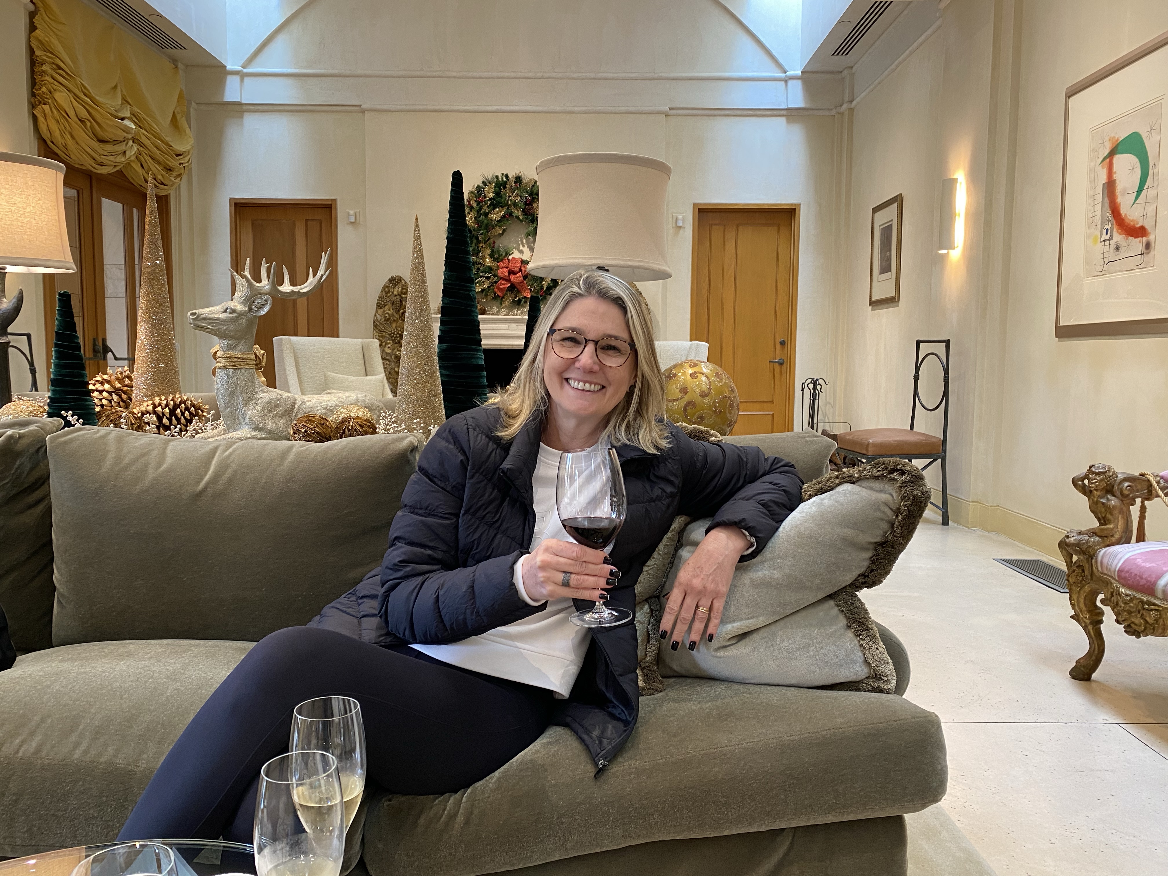 Na Opus One tem história pra contar! Seguimos, sem querer, uma cicerone que conduzia um grupo que comemorava um noivado. Estávamos aguardando na recepção e achamos que era nossa vez de entrar, provavelmente não ouvimos algo que ela explicou. Simplesmente acompanhamos um grupo que também aguardava e que me causou estranheza, pois todos estavam muito bem vestidos. Pensei somente que tinha errado no modelito escolhido e que não devia ter ido de jeans…E fomos em frente, nos mantendo mais atrás do grupo, deslumbrados com o terraço enfeitado para o natal e com uma vista maravilhosa para a vinícolas. Estava igual a um “pinto no lixo”, mas ao distribuírem taças de champanhe perceberam que faltavam dois copos. A cicerone anunciou – “probably someone is not supposed to be here…” Ihhh…