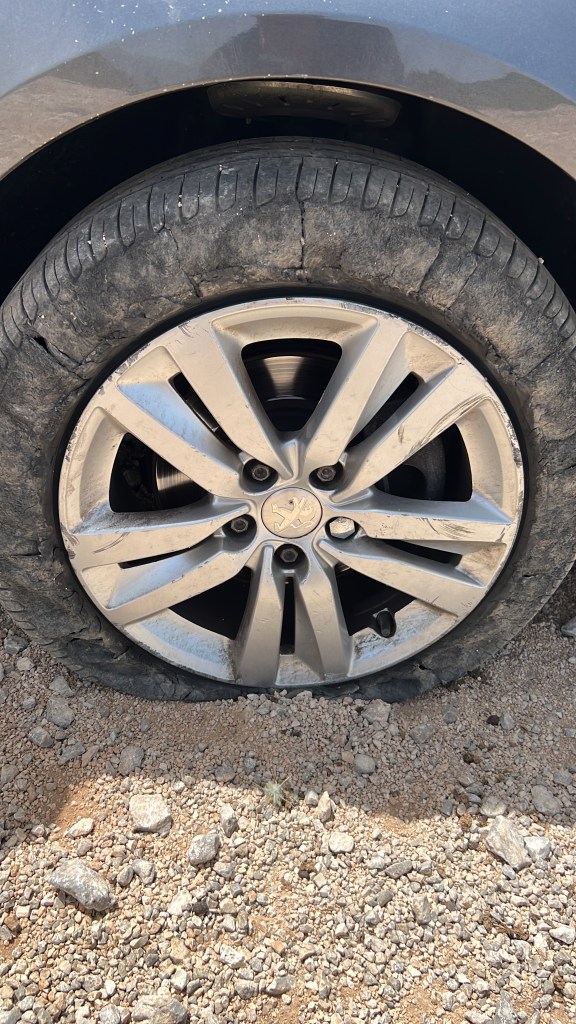 Mas nosso teste ainda não tinha acabado. E o maps nos colocou em outra enrascada. Deixamos a região da casa do Spyro 2 e fomos parar em uma estrada de terra, nos perdemos de novo e a “cereja do bolo” o pneu furou no meio do nada, sem Spyro 3 e com um dispositivo anti-furto que impossibilitava a troca do pneu. Resumindo muito de novo tivemos que andar com o pneu furado até pegar internet, aguardamos resgate por duas horas e desistimos e seguimos a pé, quando finalmente nos acharam. Exaustos, imundos e desidratados.