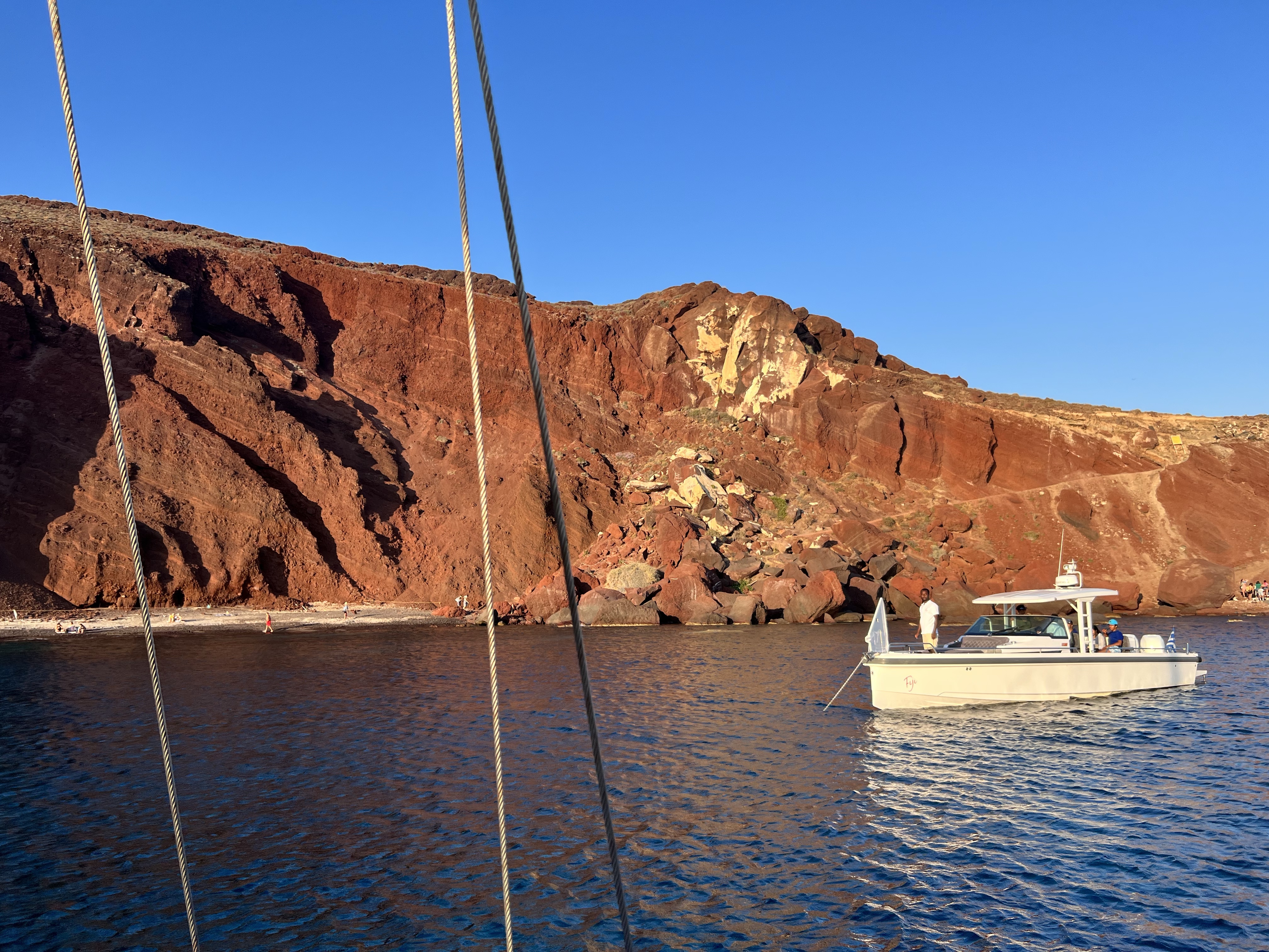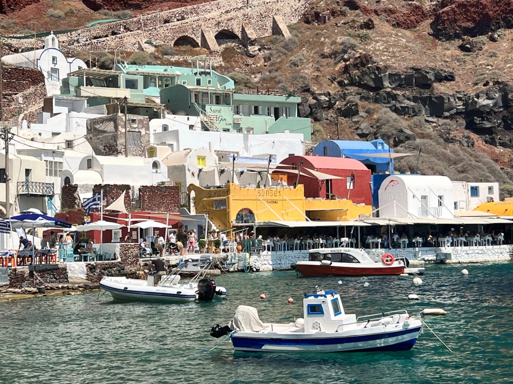 Chegamos em Santorini cedo e já tínhamos tratado o transfer para o hotel. Foi possível fazer um “early check-in” e nos arrumamos para nosso passeio de barco pelas caldeiras, com pôr do sol e jantar. Reservei pelo Civitatis, que já tinha usado em outras situações e nunca tive problemas. Nos buscaram no hotel. Foi bem legal! Nos levaram em bons locais para um mergulho, inclusive em uma ilha de lava (que apesar de água transparente em volta, tem cheiro metálico e mancha a roupa de banho de marrom), e explicaram tudo sobre os vulcões (Santorini é o que restou da borda de um deles, já inativo. Na ocasião da erupção o restante do solo colapsou e afundou no mar). Além disso os nossos 5 companheiros de passeio eram muito interessantes.