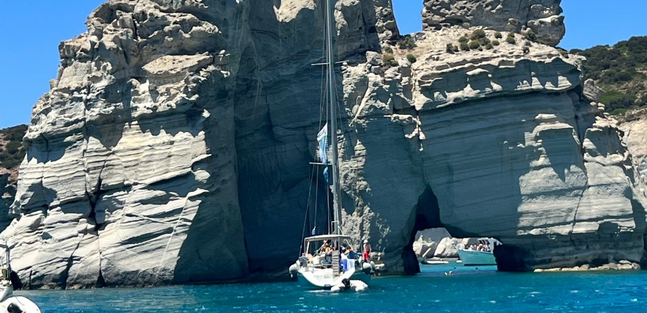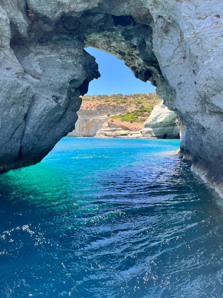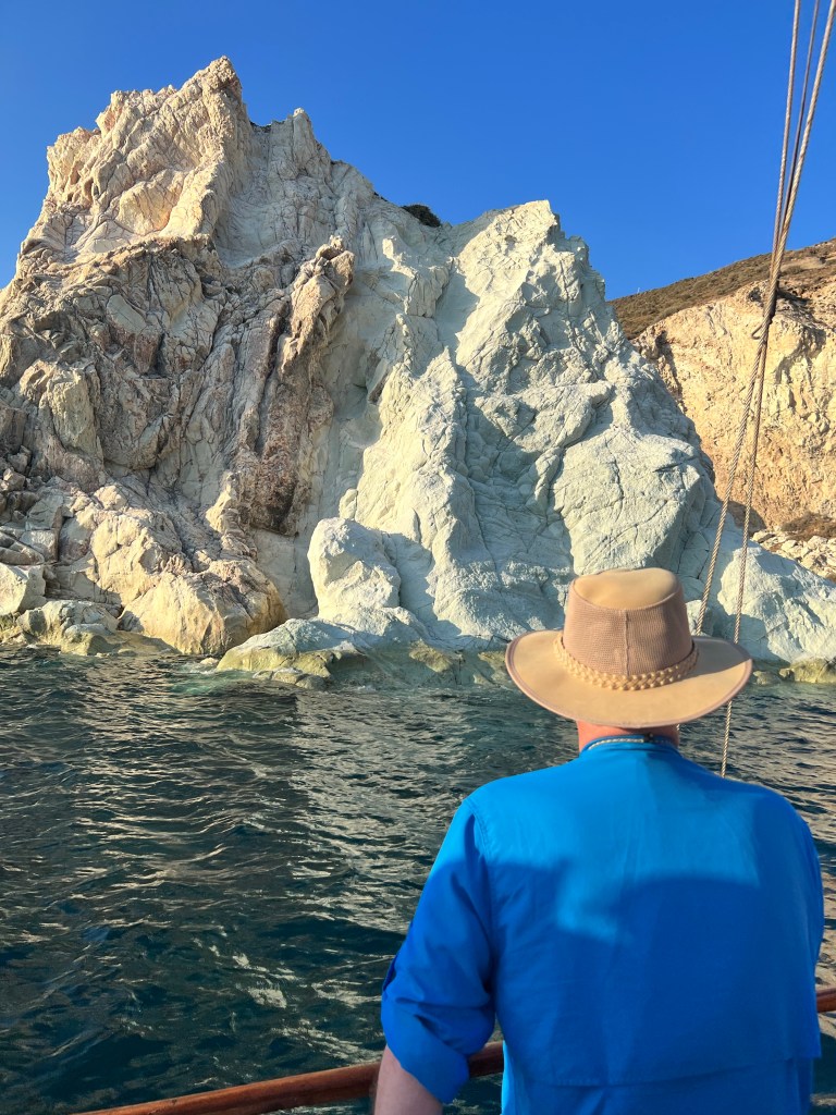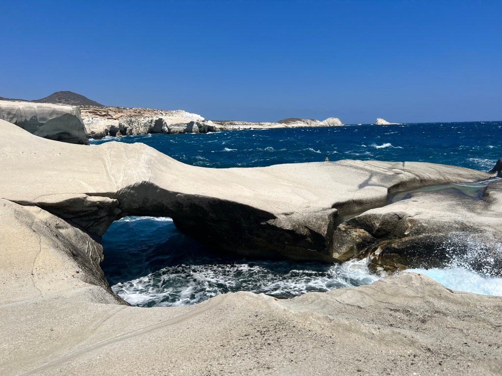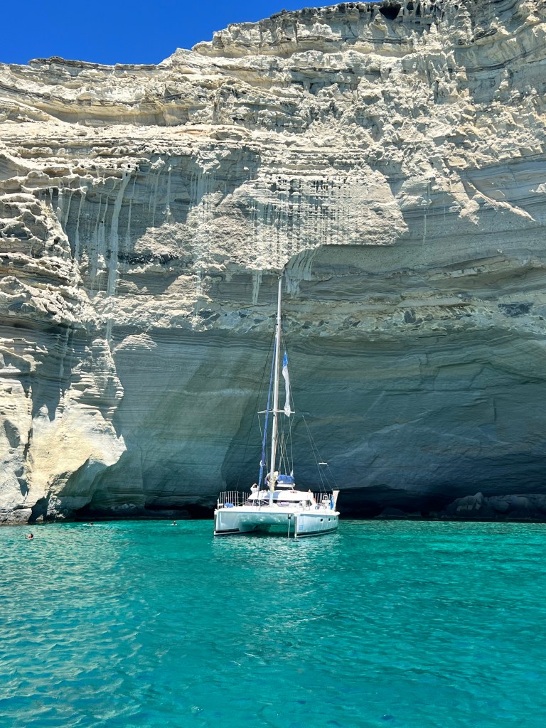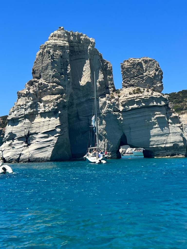 Do aeroporto passamos na loja onde tínhamos já reservado um passeio de barco de dia todo, circulando toda a ilha (tem um milhão de agências na região que fazem isso, nem precisava ter reservado). A dona comentou que estava ventando um pouco mais o que o esperado e que o passeio precisaria ser reduzido, retirando do roteiro a ilha de Polyegos. Mas não nos esclareceu que as primeiras duas horas do passeio seriam provavelmente de pura emoção. Entramos em uma verdadeira “montanha russa aquática”. Foi traumatizante e nauseante. O enjoo foi parcialmente amenizado com um chiclete que deixava a língua dormente que o capitão nos forneceu. Mas, se estiver ventando e com ressaca, por favor limitem seu passeio para meio dia, visitando somente a parte sul da ilha, onde fica Kleftiko, que é realmente linda e inesquecível.