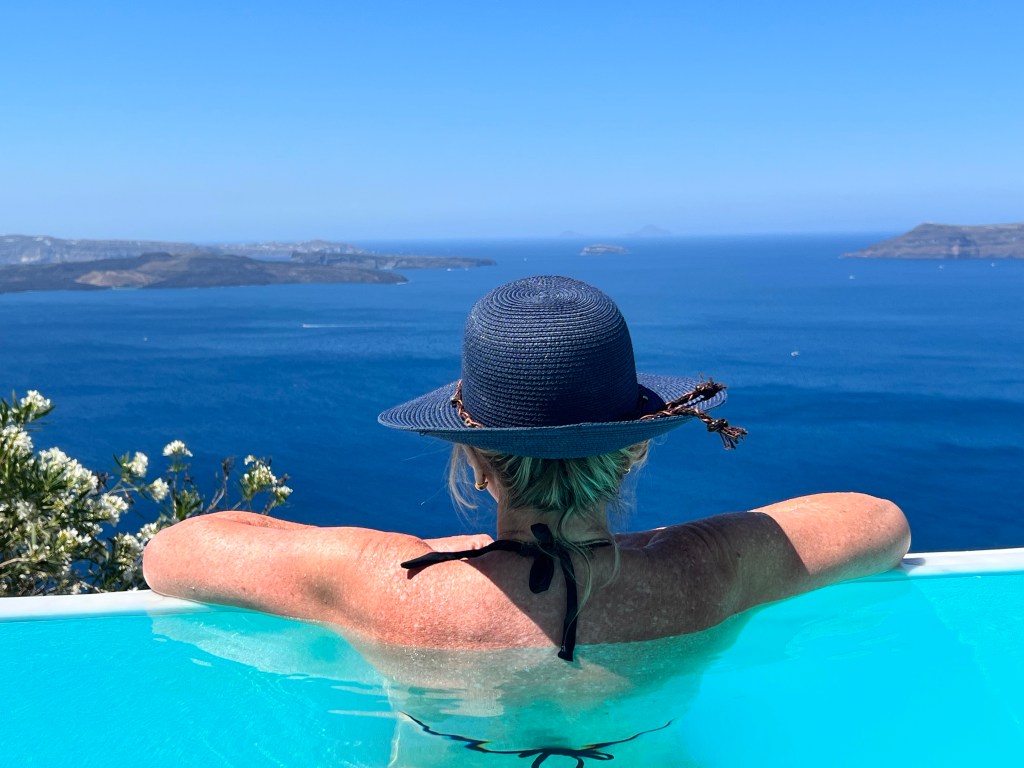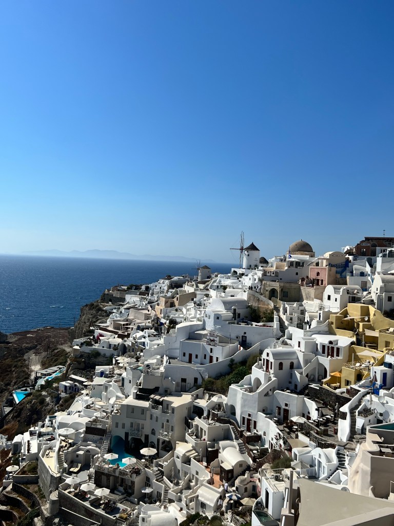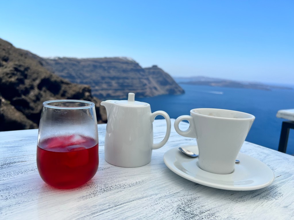 Vamos lá… de novo vou tentar escrever enquanto viajamos. No momento estamos em Santorini. Tomando café da manhã com este visual aqui…Uau!