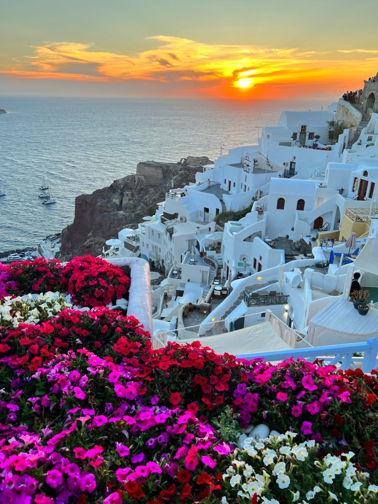 As duas localidades são muito lindas. E demos sorte, ou junho é mesmo assim, as cidades estava cheias, mas não lotadas. Oia é um UAU em cada esquina. Reservamos jantar no Castro às 19 horas (reservas por e-mail) para terminar ao pôr do sol que acontece em torno das 21 horas. Recomendo. Restaurante bom, vista esplêndida: além da visão da caldeira em chamas, também tinha flores ao fundo.