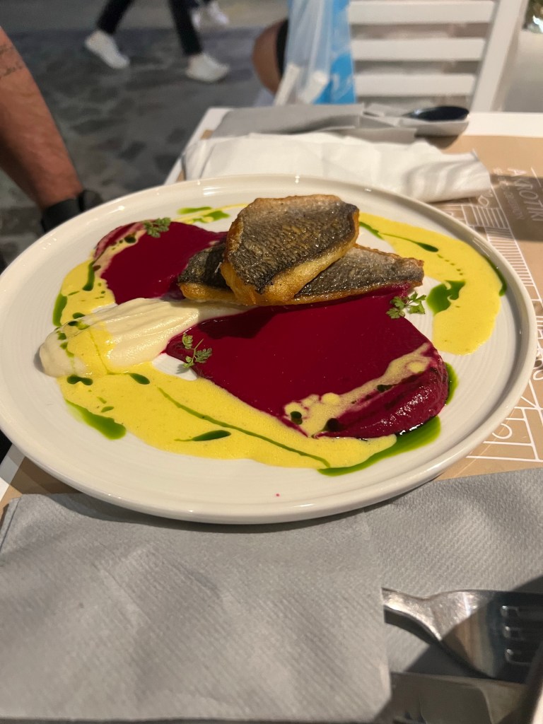 Jantamos um dia em Agia Efimia, no trajeto de volta para Argostolini, e foi o melhor jantar da viagem, em um restaurante familiar e simples. Comi um peixe empanado com lascas de amêndoas maravilhoso e marido um peixe com molho de trufas que parece ser um prato inconcebível mas que também estava dos deuses.
