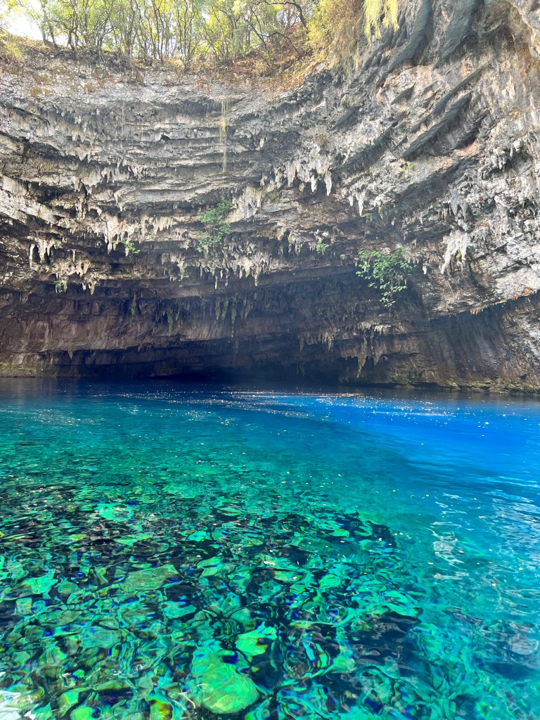 A Melissani Cave é mesmo uma linda obra da natureza. A dica de ir no meio do dia, para estar mais clara, é super válida. Fomos as 11 horas, mas penso que talvez as 12 ou 13 horas seja melhor. Você compra o ingresso no local.