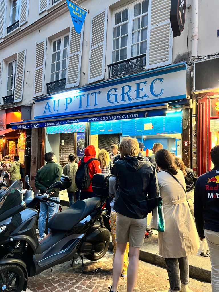 Ali por perto também tem o crepe de rua mais famoso de Paris, no Au P’tit Grec. Verdadeiro “podrão” francês. Vale uma refeição. Fica na Rue Mouffetard e você não vai se perder, pois a fila é sempre grande (mas anda rápido). É uma birosca de muito sucesso. Nessa mesma rua tem um quadrilátero muito bonitinho e parisiense, destes de filmes, com uma fonte no meio. Vale para comer e/ou tomar alguma coisa, vendo tempo passar nesse cenário. As ruas transversais são fofas também.
