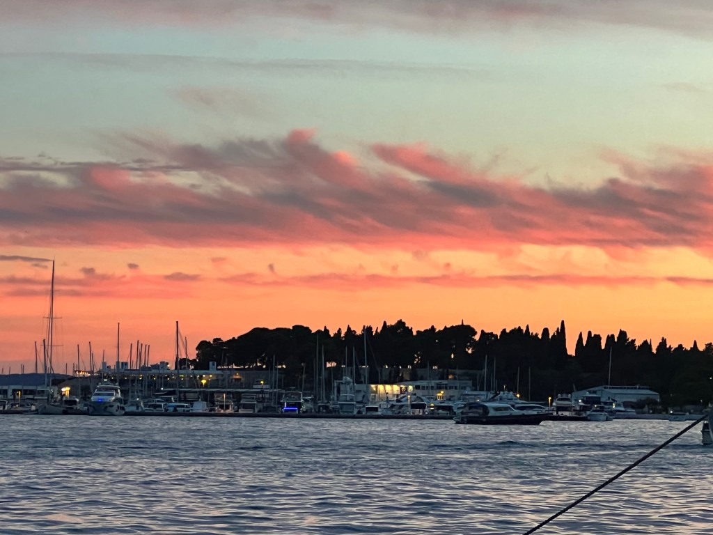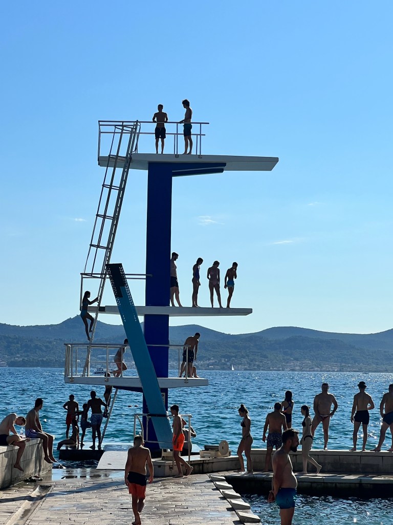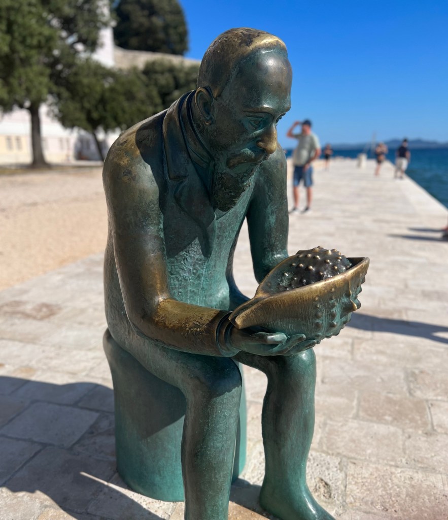 No primeiro dia demos um passeio geral e uns mergulhos. De noite, após jantarmos em um italiano (Eat Me) bem bom e que tinha seu rótulo de vinho próprio (um dos poucos tintos croatas que gostei), seguimos para as atrações principais da cidade – o Órgão do Mar (produção de sons pelas ondas do mar que penetram embaixo da calçada) e o Monumento de Saudação ao Sol (painéis solares que piscam luzes coloridas após o anoitecer).