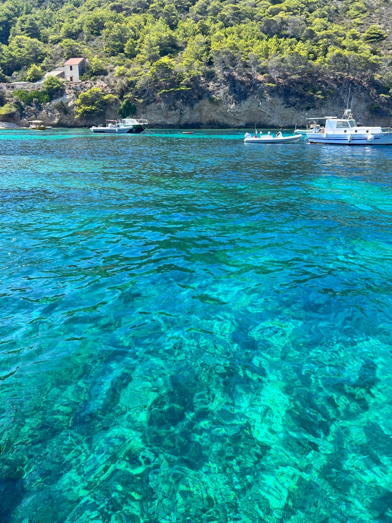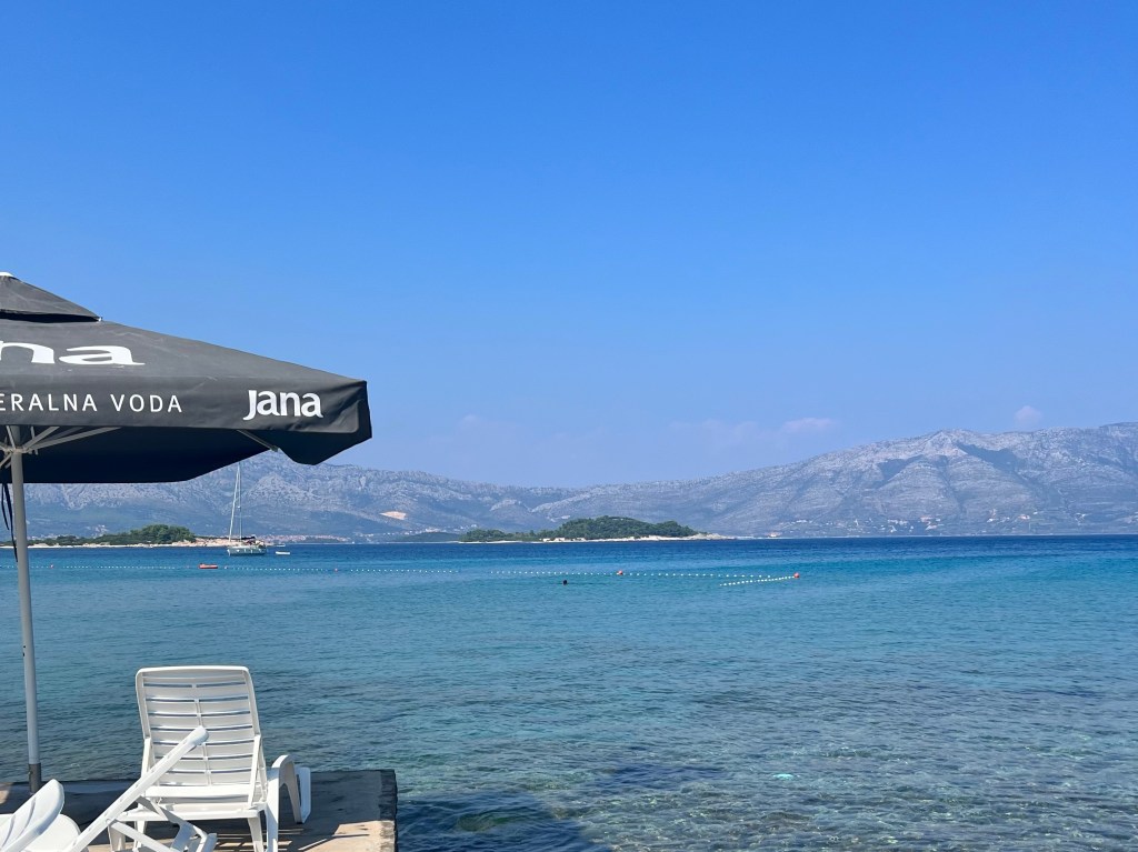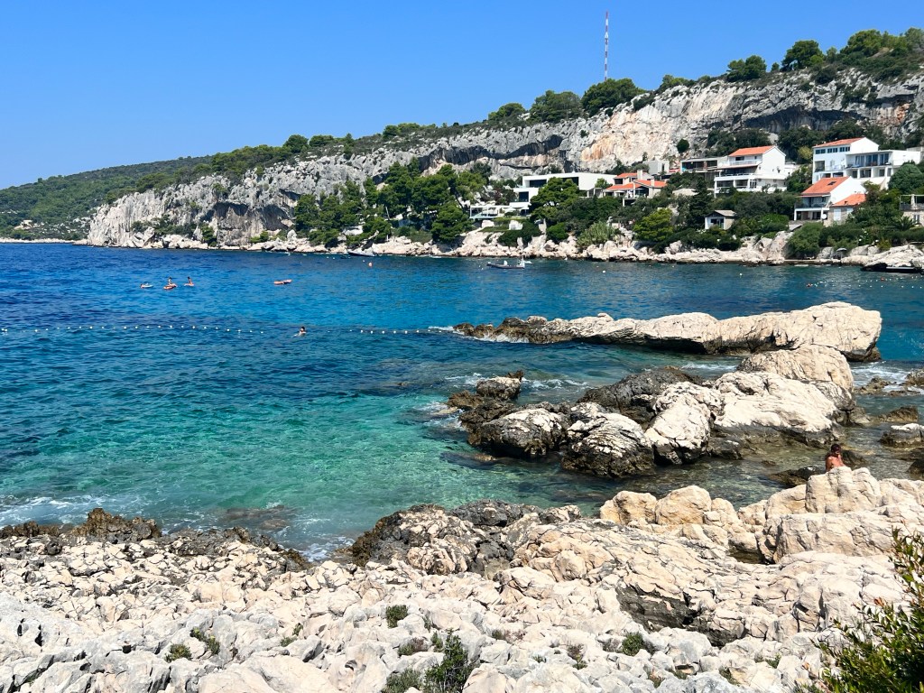 Lumbarda tem praias famosas principalmente porque tem areia, mas gostamos mesmo dos espaços nas pedras, de frente para as montanhas, com aquela água translúcida.