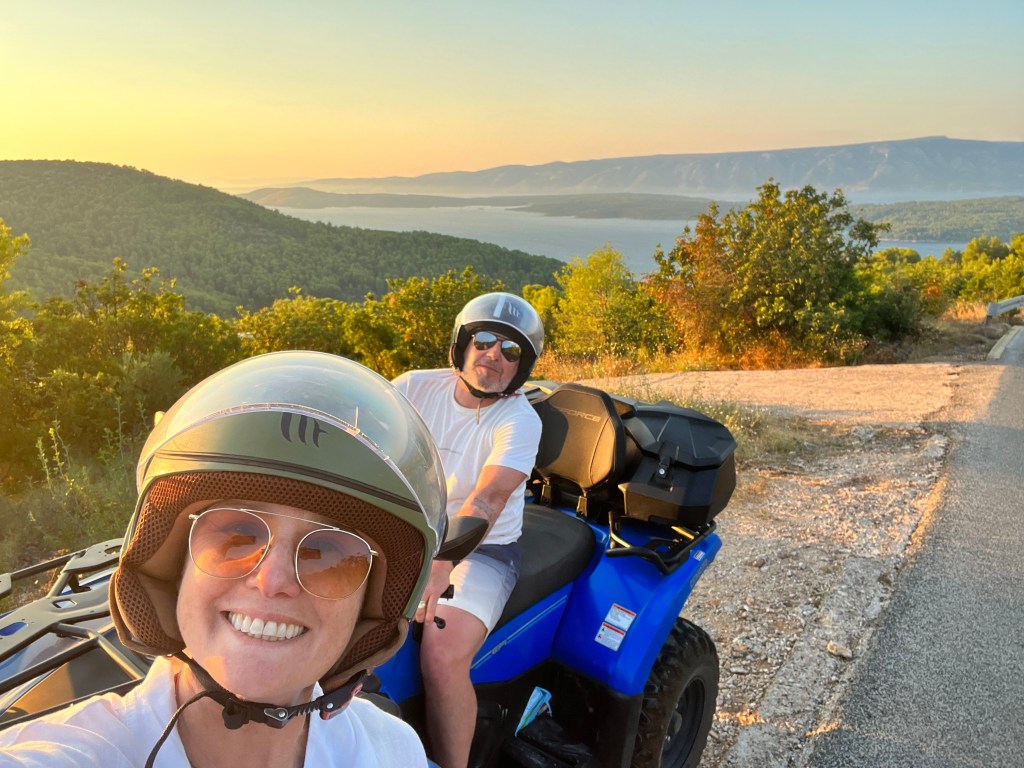 Foi bem legal esse dia do barco, mas o dia mais sensacional em Hvar foi quando saímos de quadriciclo (“quad” para os íntimos…) para visitar as praias e as cidades Stari Grad e Jelsa, voltando pelo interior da ilha. Tenho “um pouco de muito medo” de motos e similares, mas arrisquei na carona do marido mais uma vez (a primeira foi em Santorini e amei apesar do medo). A estrada não é complicada e recebemos boas dicas e um mapinha da agência onde alugamos a “motoca”. Aproveito para te convidar para também conhecer minhas histórias sobre a Grécia: Da coleção de viagens – Grécia. Uau!).