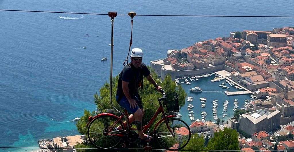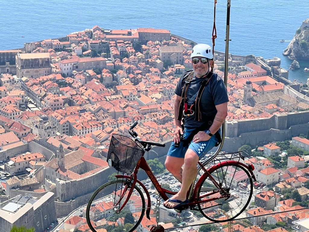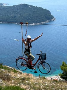 Do lado de fora da murada, perto da porta Ploče, há um teleférico para se chegar no alto de uma montanha de onde a vista da cidade é linda (essa da foto acima) e onde descobrimos uma tirolesa de bicicleta e não resistimos. Foi bem divertido. A história da criação dessa tirolesa é muito boa, e eu conto ao final desse post, para não complicar a vida de quem quer mesmo saber só das atrações da viagem.