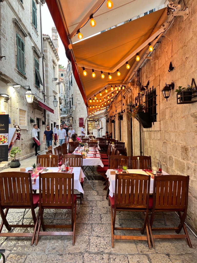 Na segunda noite fomos jantar em uma churrascaria croata raiz, a Konoba Dubrava, fora do centro histórico, que o dono da tirolesa nos recomendou. Tinha música típica e o povo cantava junto, com muita alegria. Esse ambiente foi o destaque. Os frutos do mar da entrada também estavam divinos.