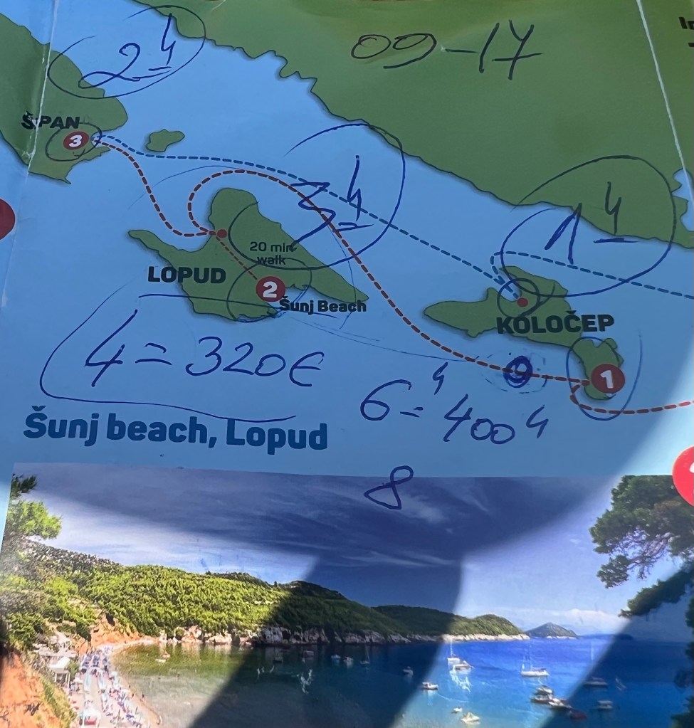 Para o segundo dia inteiro livre em Dubrovnik, acabamos decidindo reservar um passeio de barco e nos arriscamos a escolher sem dicas, meio que por intuição, em um guichê no porto. Compramos um pelas ilhas Elaphiti, que incluía transfer para o porto, bebida e comida a bordo, inclusive cervejas e também vinhos na hora do almoço. O almoço seria servido na casa do capitão em uma das ilhas, com música ao vivo. Parecia maravilhoso e de verdade “muito demais” por somente 50 euros por pessoa. Mas pensamos que finalmente tínhamos encontrado a Croácia barata, que só tínhamos ouvido falar. No fim não foi bem assim.