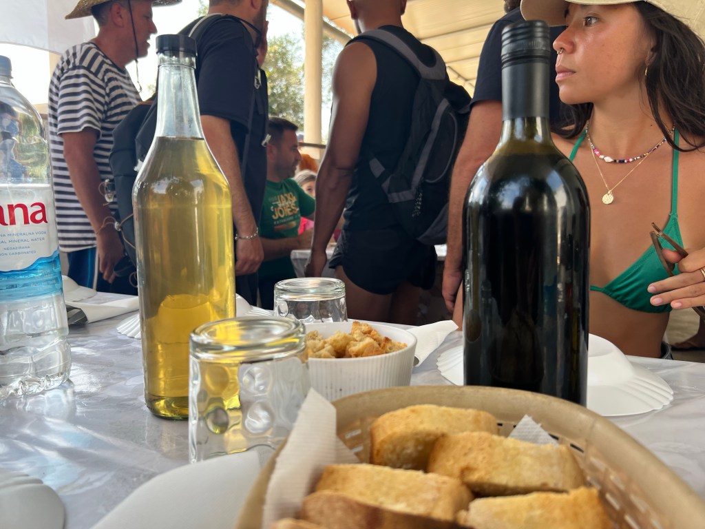 – A parte ruim: a bebida foi um fiasco completo. Vocês já viram cerveja de 2 litros em garrafa pet? Eu vi nesse passeio. Foi a pior cerveja que experimentei em toda a minha vida. Os refrigerante eram tubaínas croatas, super adocicadas, também horríveis. E os vinhos branco e tinto, produzidos pelo dono da casa e servidos no almoço, eram impossíveis de sequer engolir o primeiro gole – tive que disfarçar e engolir rapidamente com água para não cuspir. Mas quando estamos de bem com a vida, como estávamos, toda essa experiência vale boas gargalhadas. Nos restou água da casa e parada estratégica em um barzinho de uma das ilhas para uma loira gelada decente.