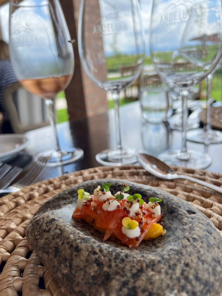 Mendoza é um destino para adultos, para beber vinhos e comer bem. Na primeira vez, em 2017, ainda ousamos levar nossos meninos jovens (naquela época que eles sempre tem fome), e, além dos almoços nas bodegas, também jantamos todas as noites. Estivemos no Francis Malman, no Azafrán e no Brindillas que estava iniciando suas atividades. Não gostamos nada da comida do primeiro (embora o restaurante seja lindíssimo), o segundo foi somente um jantar “ok”, mas o último foi realmente algo inesquecível, uma das melhores experiências gustativas da minha vida (nesse fomos sozinhos, os “meninos” foram se aventurar na noite argentina).