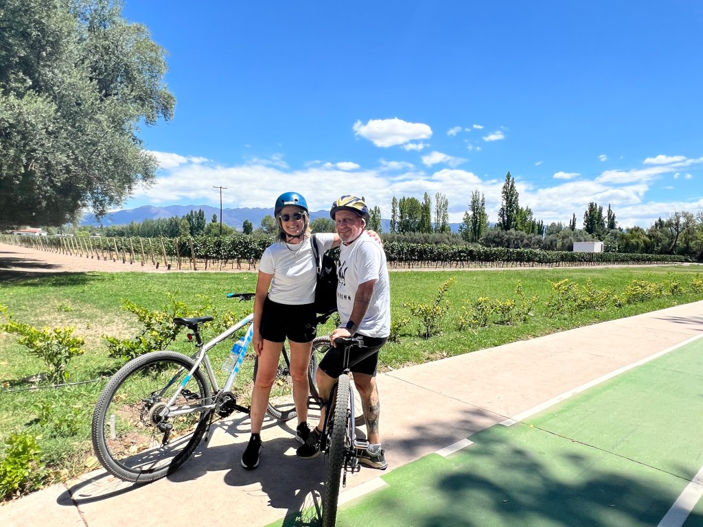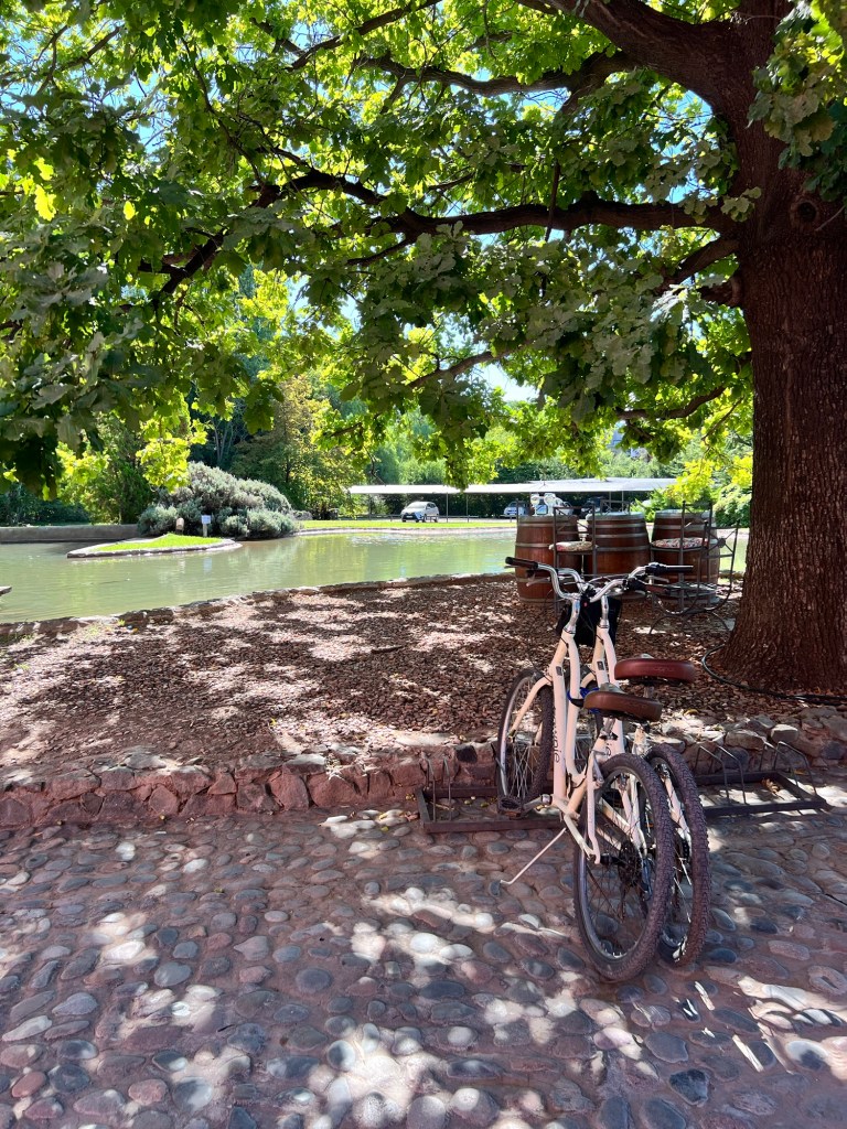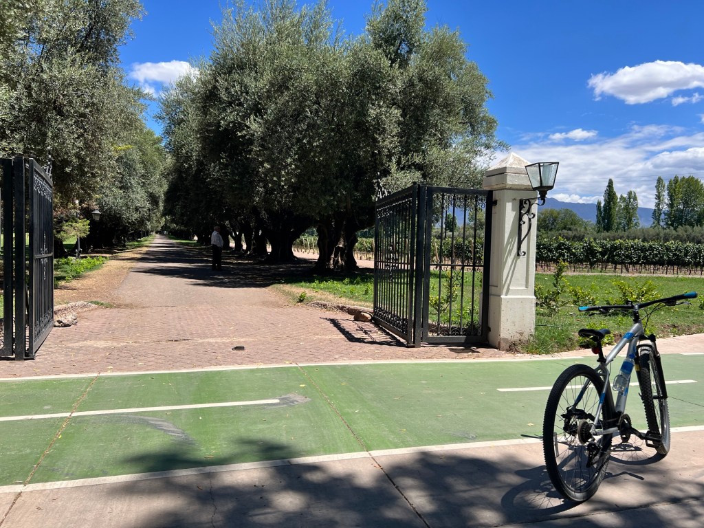 No segundo dia fizemos um passeio de bicicleta por Chacras de Coria, um bairro mais residencial e arborizado, onde ficam bodegas menores, mas também a Vistalba e a Nieto Senetier (que vimos só pelo lado de fora e parece lindíssima). Também é possível visitar o bairro de Uber, ou mesmo andar a pé algumas distâncias. Usamos um guia da @baccusbiking, mas é muito fácil irem sozinhos, e acredito que nos teria dado mais liberdade para paradas e trajetos. Tem ciclovia em quase todos os lugares e outras locadoras de bikes no bairro.