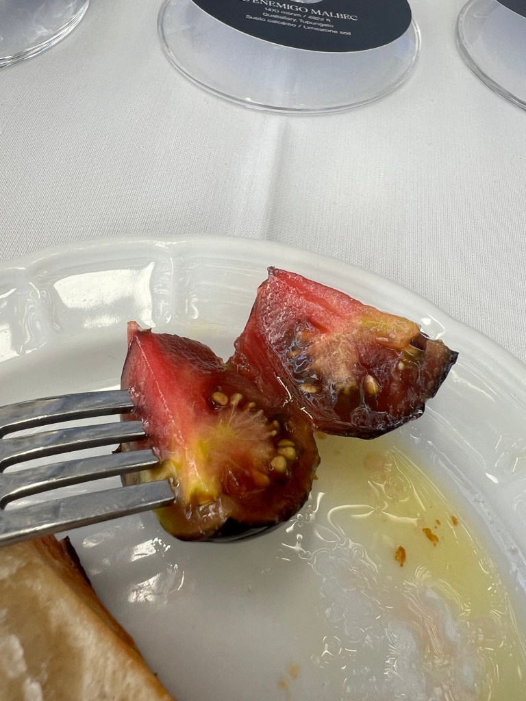 E atenção vegetarianos. Comer em Mendoza é uma soma do astral, do vinho e, especialmente, das carnes. A maior parte dos lugares que tem vários “passos” seguem cardápios bem parecidos, usando muito vegetais frescos e as frutas da época nas entradas e sobremesas (comemos tomates de todos os tipos e formas de apresentação), mas sem muita criatividade ou especial sabor. Porém, as carnes, são espetaculares, muitíssimos bem preparadas, e junto com os vinhos fantásticos e o ambiente, equilibram a refeição. Comemos vários tipos de carnes deliciosas. No Fogon, restaurante da vinícola Lagarde, comi o pato mais bem feito que já experimentei (sou bem crítica com pato pois amo essa carne).