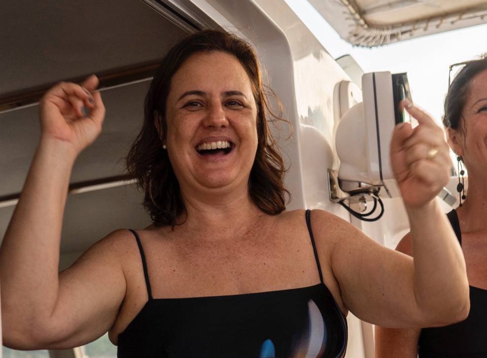 E agora Vivi. Também amiga de porta de escola que ficou para sempre. Coração gigante, generosidade em pessoa, não sossega quieta sem novos desafios, funções, trabalhos ou missões. Foi repórter, dona de comércio, cuidadora em uma creche, fez quentinha para vender e agora faz para doar. Mãe coruja de Bianca e Pedro, esposa de Norman, que é o dono do Blau (barco que alugamos). Era ciumenta a beça, mas acho que passou… afinal esse bilau é só dela (kkkkkkk não podia perder a piada). Essa minha amiga do bem, é distraída e livre, o que faz a nossa relação ser leve assim. Ano passado me deu o presente que inspirou esse nosso passeio então agradeçam a ela. Ahh… e ela não sabe fazer nada pouco ou comum… sempre tem ideias e surpresas… aguardem!