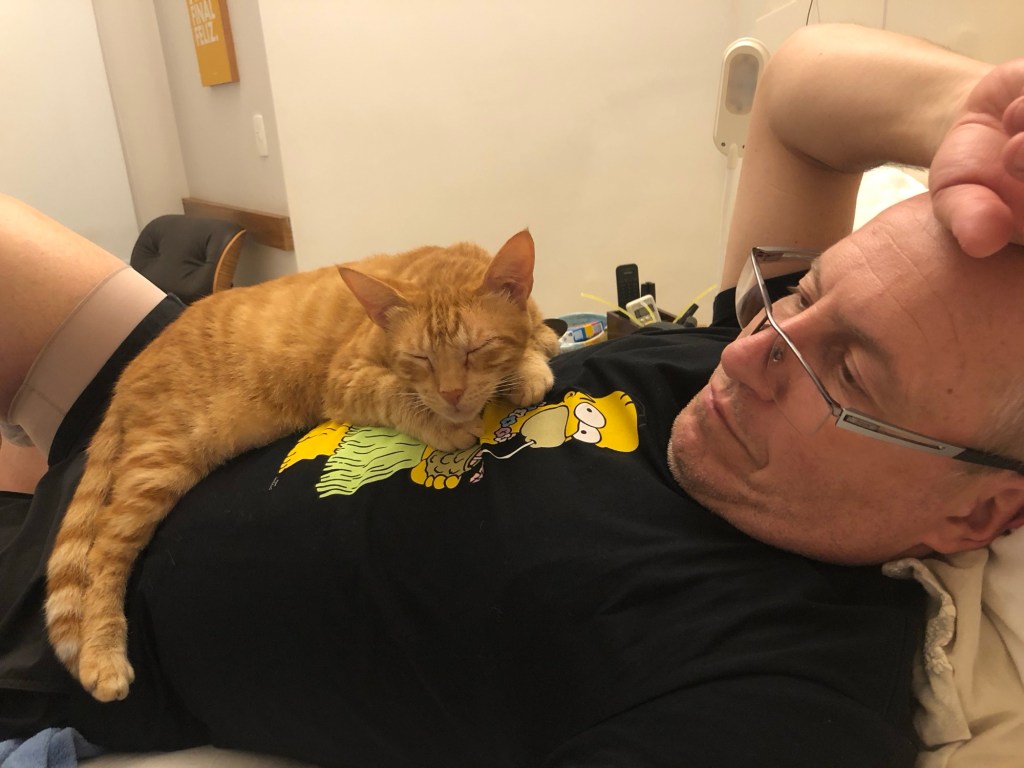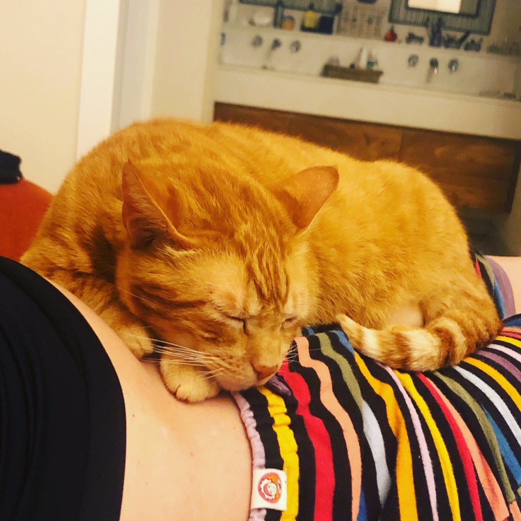 Nunca me acostumei com a irreverência felina, prefiro cachorro babão e de amor incondicional. Mas ele conquistou o meu marido, que era quem mais gostava dele lá em casa, além, claro, do caçula. Também suspeito que tenha ajudado na tal reversão da energia negativa, pois vivia deitando nas nossas barrigas e dizem que fazem isso para restaurar nossos chacras.