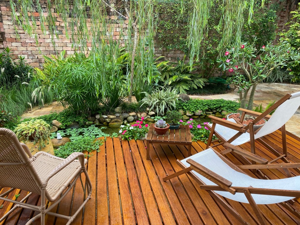 Ficamos muito felizes com esse cantinho, bem na porta do nosso quarto, com direito a um Salgueiro, muitos peixes coloridos, uma linda flor do deserto gigante, espreguiçadeiras e fogueirinha para dias frios. Meu marido passava o final de semana cuidando das características da água, das pedras, dos filtros e das plantas.