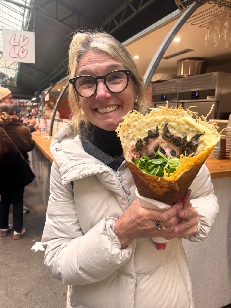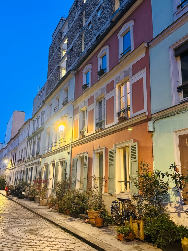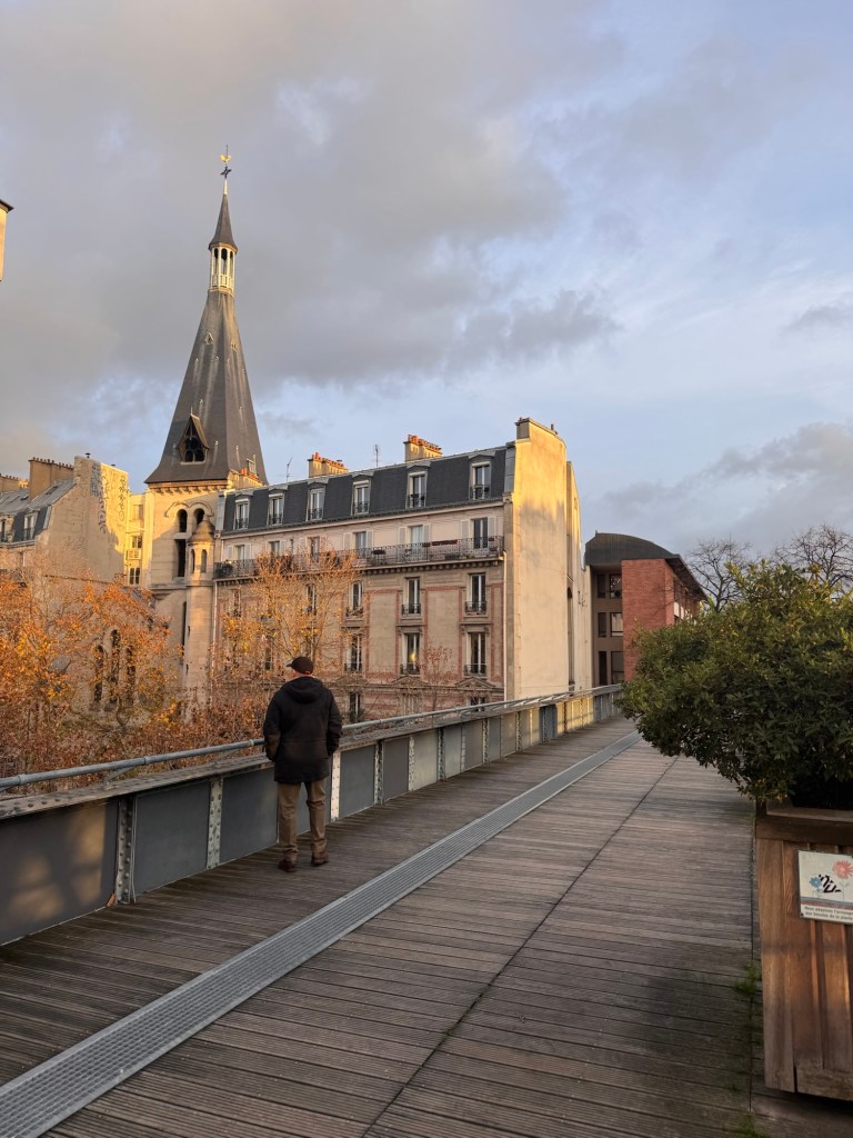 Perto da Gare de Lyon visitamos o Promenade Plantée, um jardim suspenso sobre uma linha de trem desativada, que não conhecíamos. É um lugar muito agradável, com ateliês diversos na base da estrutura (Viaduc des Arts). A luz do pôr do sol, embora com o dia nublado, estava linda ali. Também vimos a Rua Crémieux, famosa por suas casinhas coloridas (pena que estava já quase escuro) e demos uma olhada no Le Train Bleu, um restaurante lindo demais, dentro da estação, mas que achamos muito formal para o que queríamos para aquela noite. Acabamos escolhendo um café aletório na redondeza, mas que tinha ótima comida típica francesa, como costuma ser em quase toda Paris. Obs: somos viajantes que não reservam todas as refeições em locais especiais. Gostamos, em muitas ocasiões, de só olhar, gostar do ambiente e do cardápio e apostar. Desta vez usamos muitas vezes o chat GPT para nos dar uma noção da avaliação dos restaurantes ao redor de cada local que estávamos e achamos que deu bem certo.