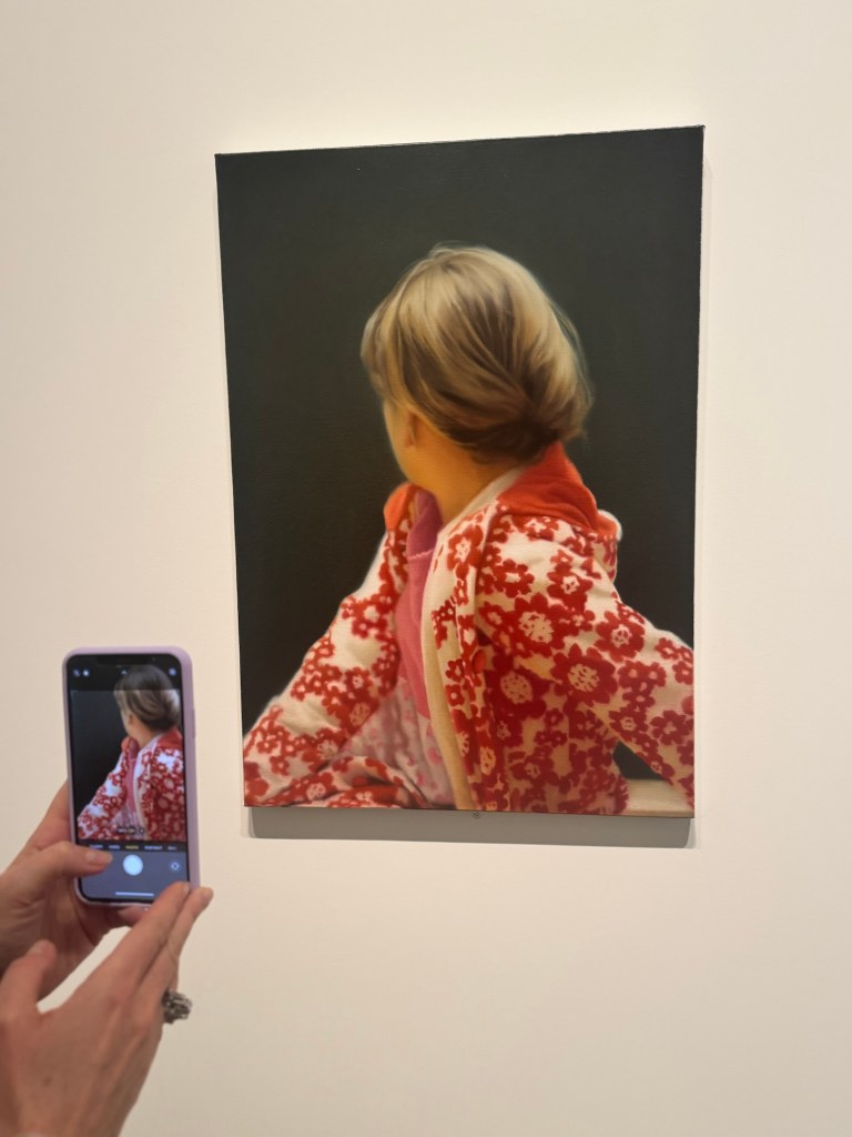 Além disso a exposição atual me surpreendeu demais. Se tiverem a oportunidade, em qualquer lugar do mundo, de conhecer os trabalhos do Gerhard Richter, um alemão inacreditavelmente talentoso e versátil, não percam. Ele já fez um pouco de tudo, mas seu dom de misturar cores e de criar pinturas realísticas é de deslumbrar qualquer um. São 60 anos do seu trabalho nesta exposição, que ainda vai até março de 2026. Um dos destaques para mim foi um dos quadros que pintou de sua filha, vestindo um sueter estampado de vermelho. O cabelo, a roupa, difícil entender como consegue capturar tantos detalhes… Talvez a explicação venha também do seu método de trabalho. Uma de suas telas gigantes, logo no início do trajeto da exposição, é um traço amarelo sobre um fundo vermelho, feito com um pincel grosso. Com a foto deste borrão na mão, e agora com pequenas pinceladas, ele torna macroscópico cada detalhe da imagem da tela e das tintas que derivaram deste simples ato de borrar um traço. E os abstratos? Fazem com que a gente pare na frente e tente entender melhor o grande impacto positivo da escolha das cores. Há muita energia ali. Apaixonei.